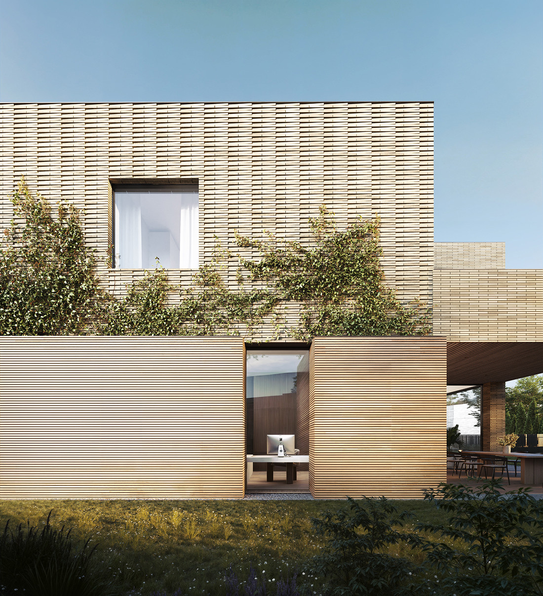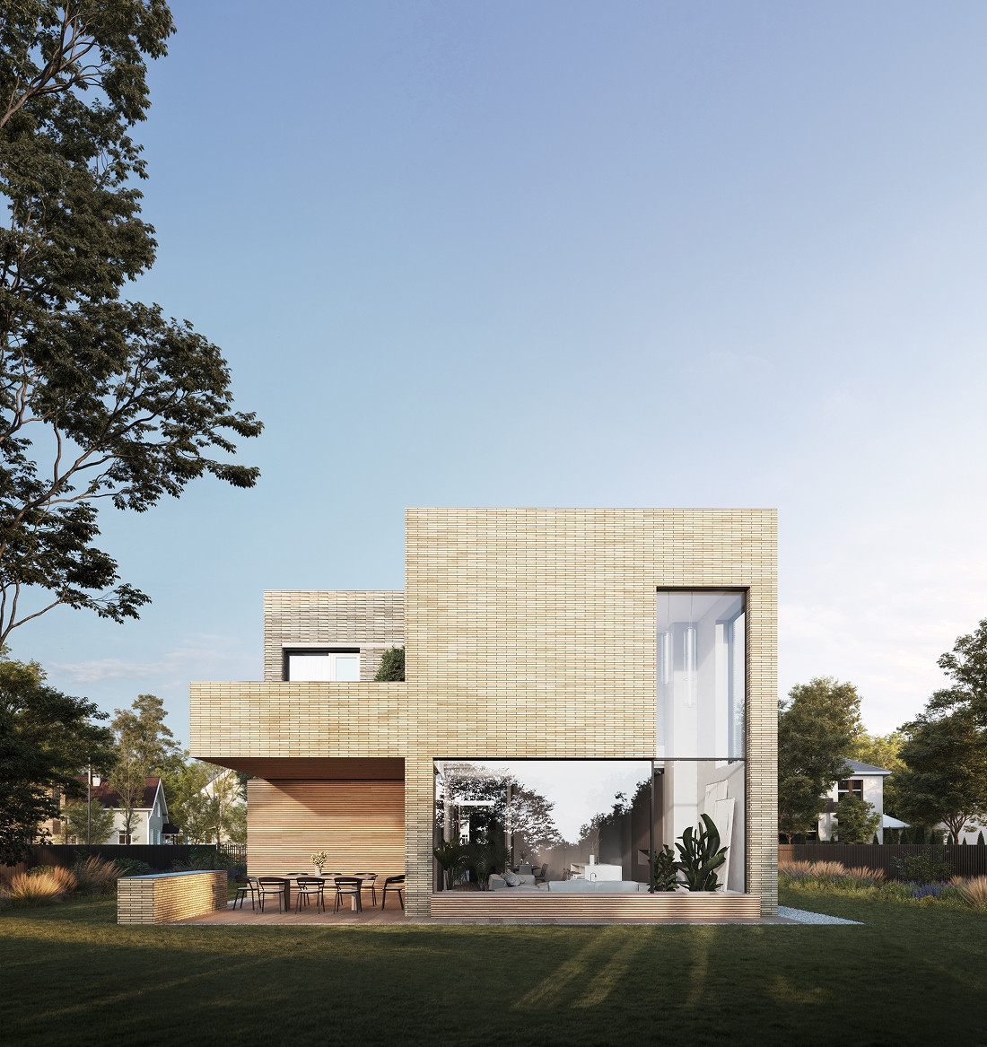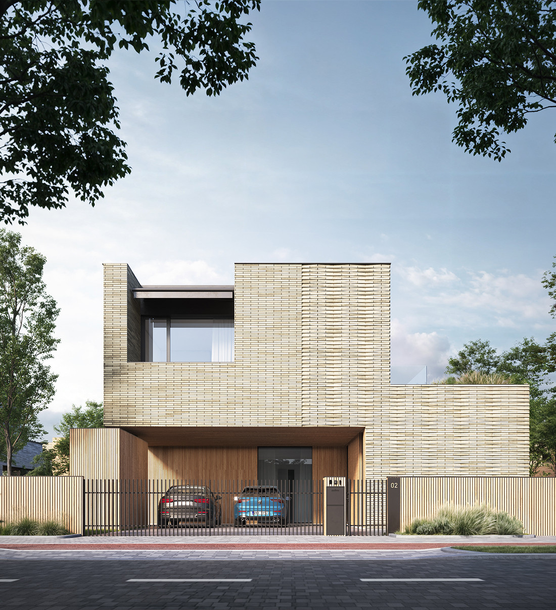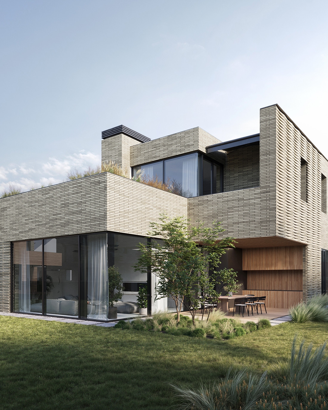 The project is built on the principle of unity and diversity. This is not a row of identical houses, but an ensemble where each unit retains its individuality while belonging to a cohesive whole. Dynamism is achieved through offset volumes and a combination of flat and pitched roofs, so the complex’s appearance changes depending on the viewing angle and lighting.