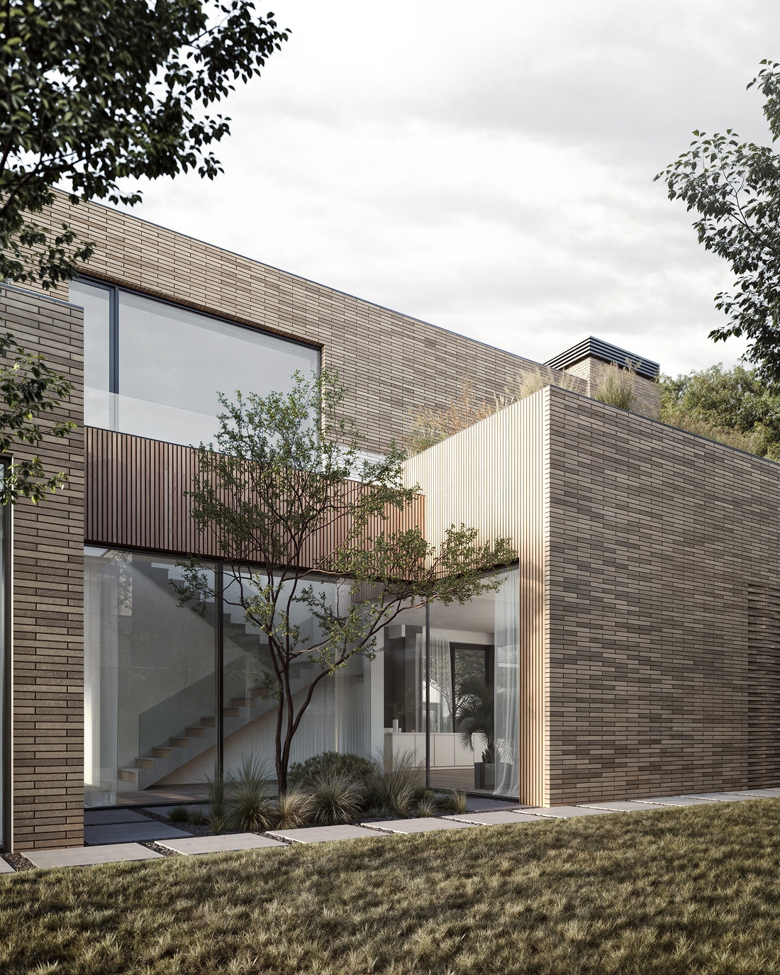 Brick solidity contrasts with the warmth of wood, while smooth glazed pitched elements add a contemporary accent. Alternating full-height glazing and intimate window openings creates rhythm, modulates light, and makes the architecture alive and expressive.