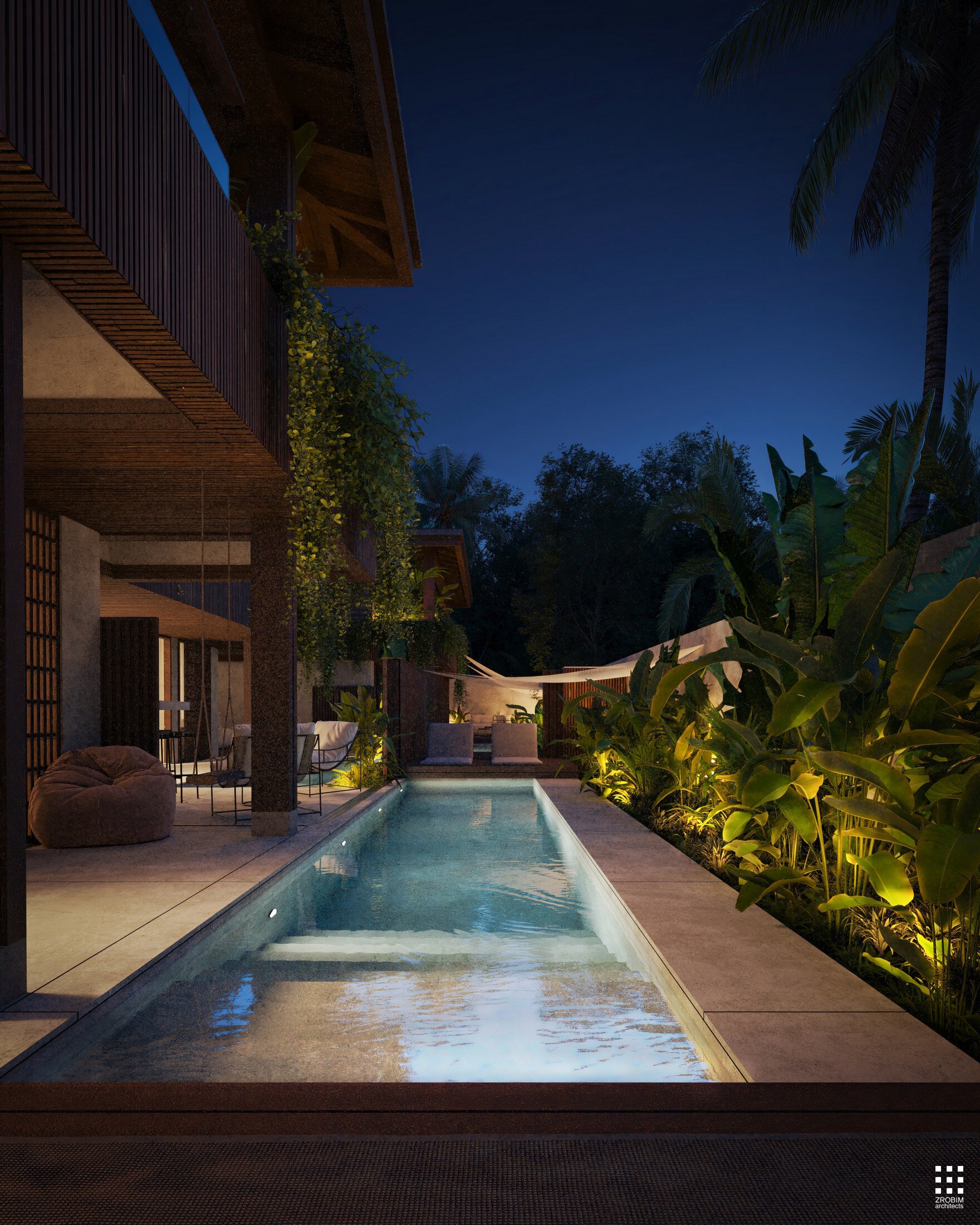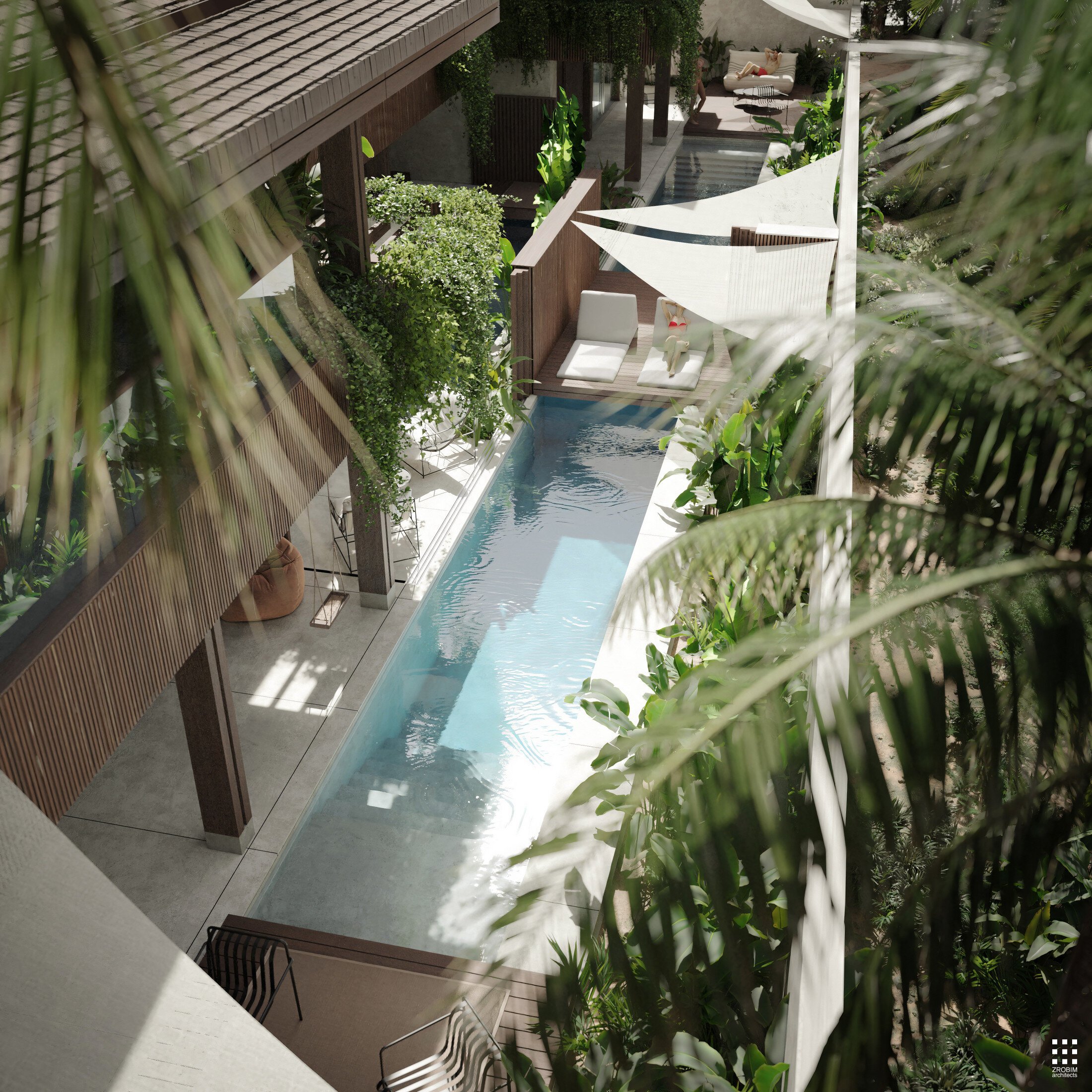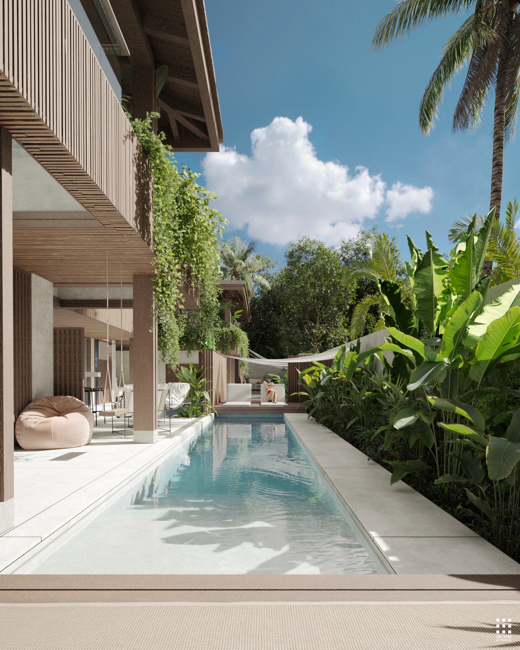 Each villa features its own private pool and terrace; however, when the partitions are fully opened, the space transforms into a unified composition. The three pools become visually and physically connected, while the terraces create a continuous shared zone with seamless circulation.