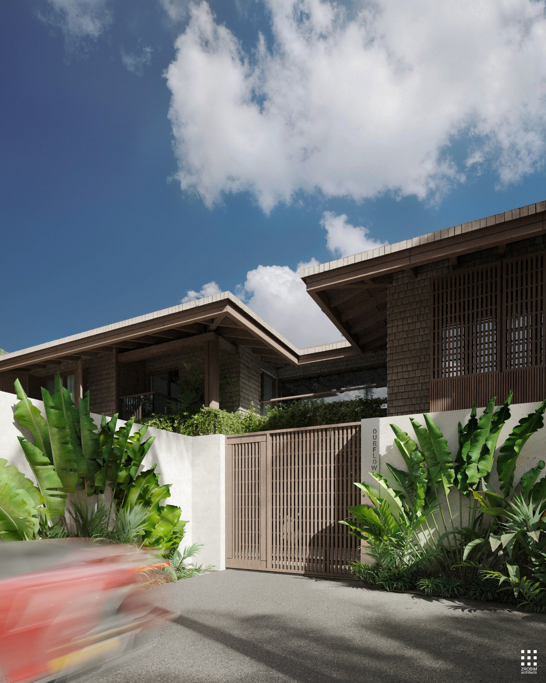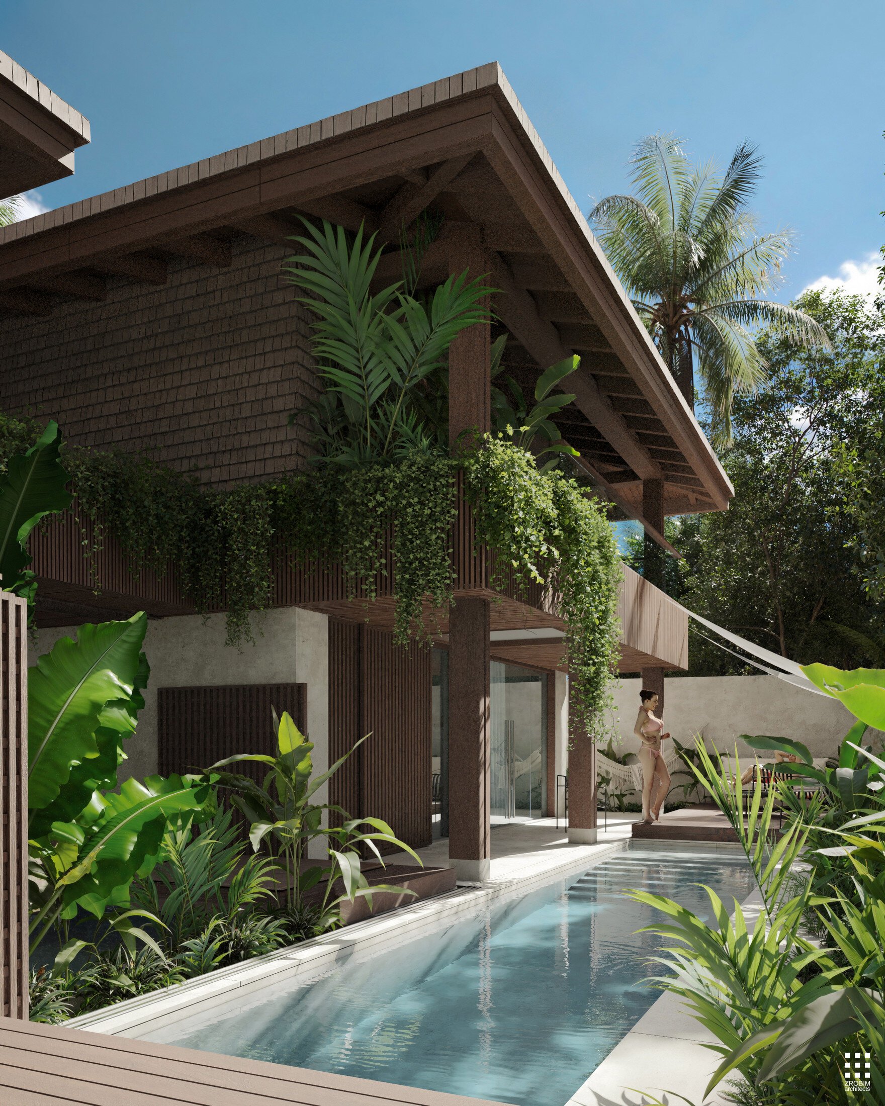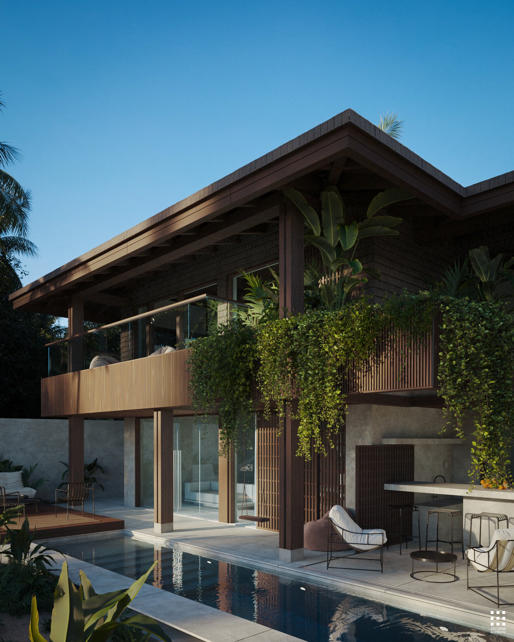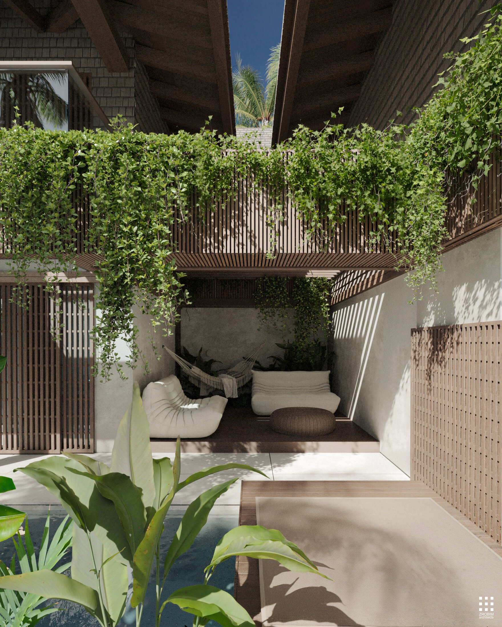 Each villa features its own private pool and terrace; however, when the partitions are fully opened, the space transforms into a unified composition. The three pools become visually and physically connected, while the terraces create a continuous shared zone with seamless circulation.