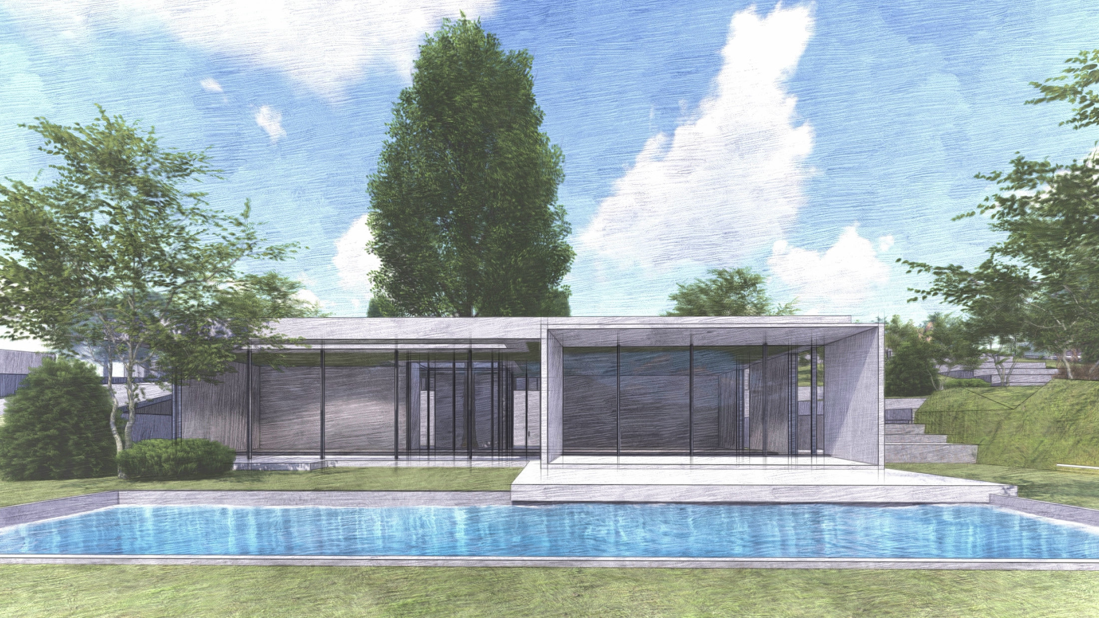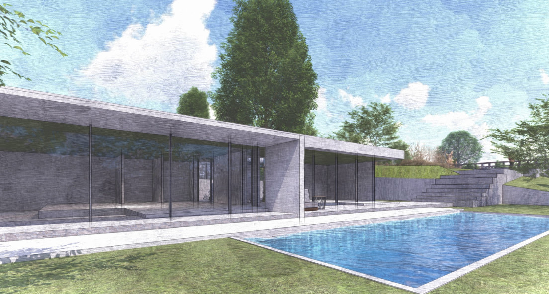 A compelling feature of the restaurant building is the placement of pylons on the cantilevered terrace above the pool. These pylons provide privacy for those relaxing on the patio by shielding them from outside views, enhancing the sense of seclusion and comfort.