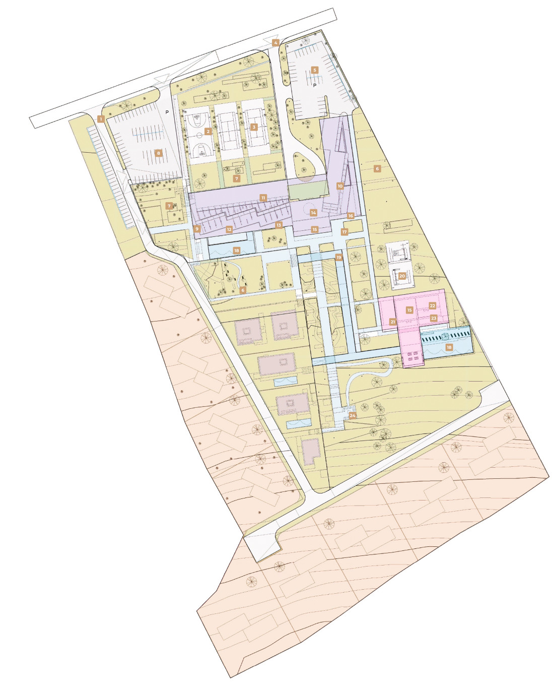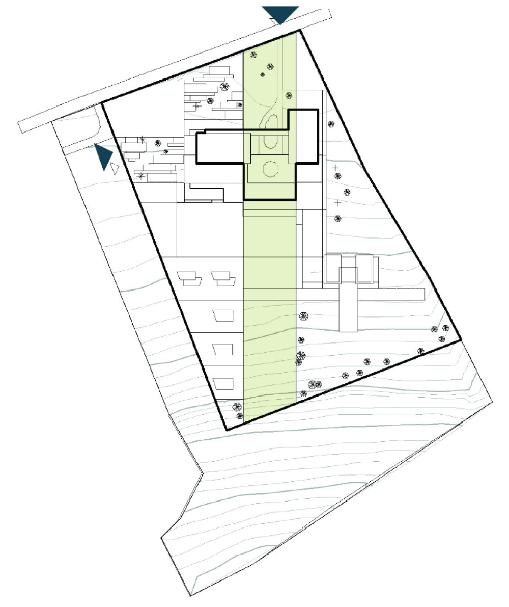 The zoning and placement of the complex were influenced by the non-parallel boundaries of the site and the natural landscape contours. To minimize excavation work, we aligned the entire complex with the existing landscape, integrating it seamlessly into the terrain.