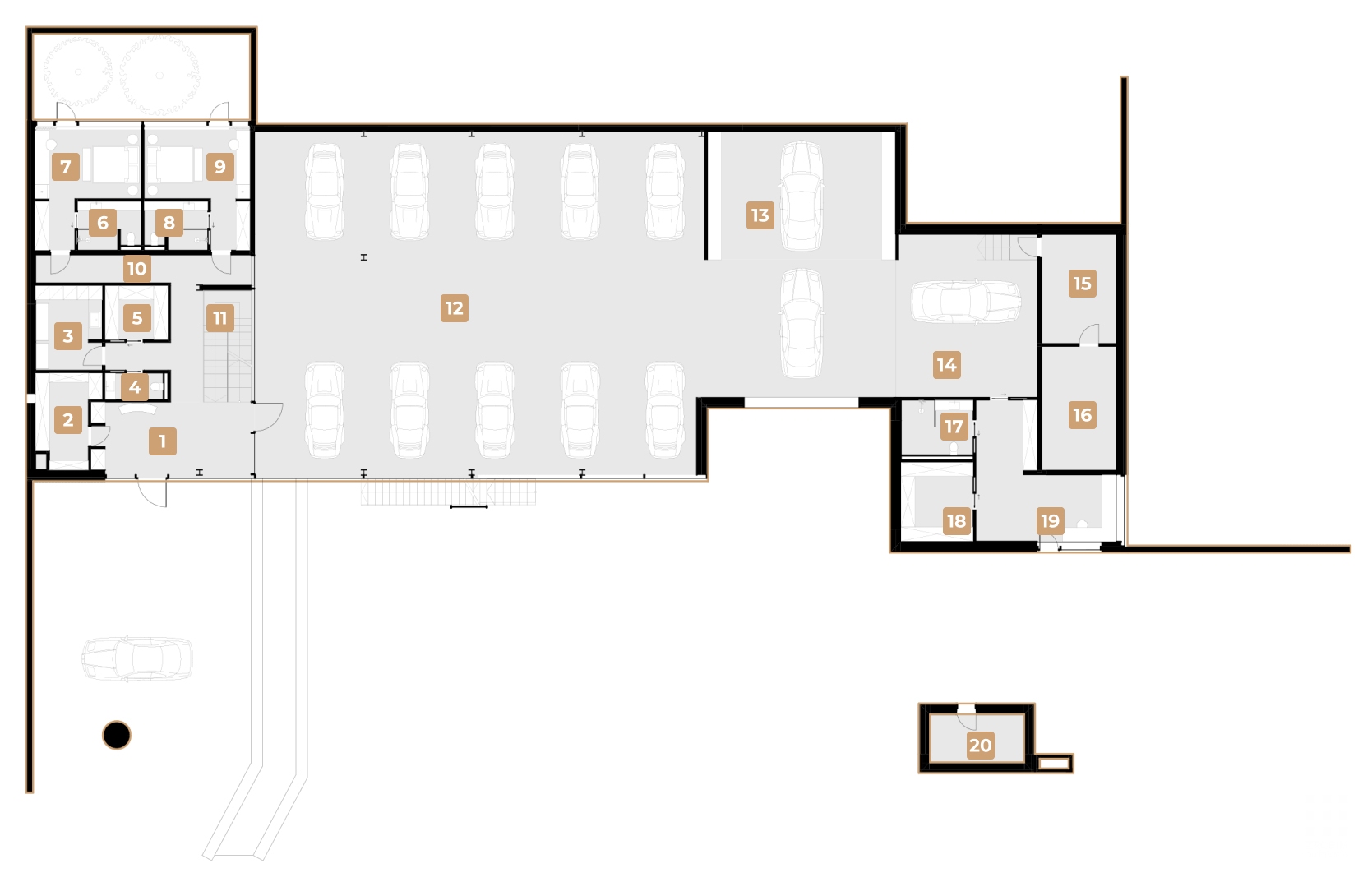 A private LEGO showroom, designed as a glass cube with variable lighting scenarios, a workshop, a striking car hangar visible from different areas of the house, and a bridge connecting the two wings — elements that create a unique spatial dramaturgy. The two-level hangar, with its clear window rhythm and rotating platform for convenient parking, becomes not just a functional hub but an architectural accent, uniting the main living spaces and setting the dynamic tone for the entire house.