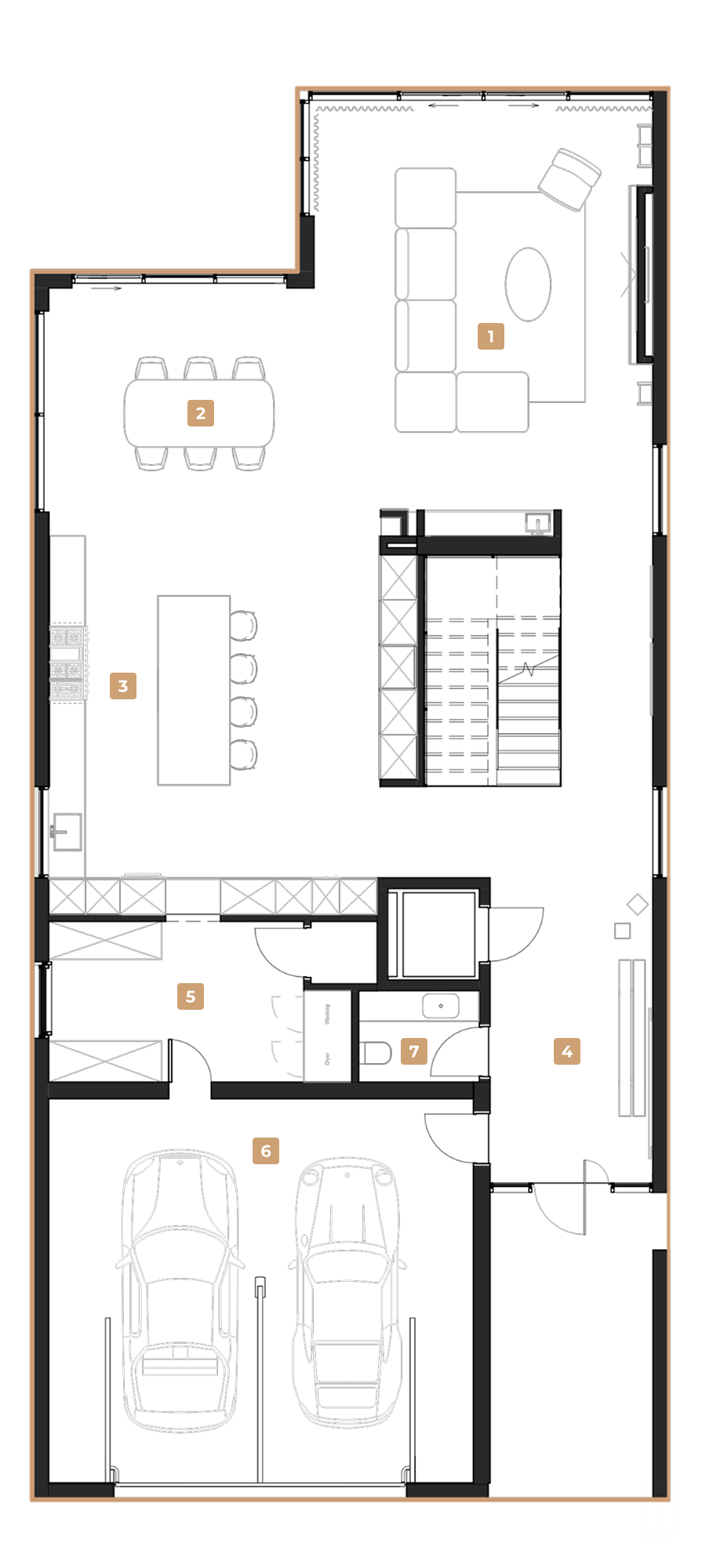 The interior architecture is designed so that panoramic glazing becomes a key element of the space: the boundaries between interior and exterior are visually blurred, uniting the home with its surroundings.
